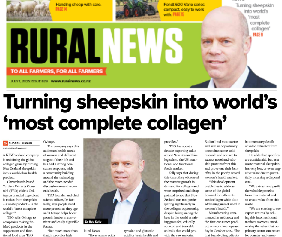 Christchurch-based Tertiary Extracts Ōtautahi (TEO) is launching a capital raise to scale production of its innovative ovine collagen, Ovitage®, which repurposes over 550 tonnes of waste sheepskins annually into high-value ingredients for health, supplement, and personal-care markets...
